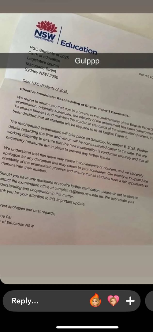 <div class="block-content"><div class="styles__Container-sc-1ylecsg-0 goULFa"><span>A letter purporting to be from the NSW Education Standards Authority about a rescheduled Higher School Certificate (HSC) exam has been labelled a hoax.</span></div></div><div class="block-content"><div class="styles__Container-sc-1ylecsg-0 goULFa"><span>The viral photo of a notice that English 2 students are required to re-sit their final exam has been identified as false, with the education board slamming the scam as "unnecessary stress for students".</span></div></div><div class="block-content"><div class="styles__Container-sc-1ylecsg-0 goULFa"><span>"We are aware of a hoax being shared online concerning 'rescheduled exams' for English Paper 2," a spokesperson for the NSW Education Standards Authority said in a statement released on Saturday night.</span></div></div><div><div id="adspot-mobile-medium"></div></div><div class="block-content"><div class="styles__Container-sc-1ylecsg-0 goULFa"><span>"This is false and is incredibly disappointing. </span></div></div><div class="block-content"><div class="styles__Container-sc-1ylecsg-0 goULFa"><span>"Sharing hoaxes contributes unnecessary stress for students, who are focused on preparing for their exams. </span></div></div><div class="block-content"><div class="styles__Container-sc-1ylecsg-0 goULFa"><span>"HSC students are advised to disregard rumours and hoaxes about exam content or schedules shared on any platform. Always contact your school directly if you have any concerns or questions."</span></div></div><div class="block-content"><div class="styles__Container-sc-1ylecsg-0 goULFa"><span>The letter, which appears to be on a NSW Education Standards Authority letterhead, states the exam was compromised and "due to a breach in the confidentiality", the exam would be done again for all students.</span></div></div><div><div class="OUTBRAIN" data-reactroot="" data-src="//www.9news.com.au/national/hsc-english-2-exam-hoax-slammed-by-nsw-education-standards-authority/e9104205-20d7-45b5-801b-216140fc8c94" data-widget-id="AR_5"></div></div><div class="block-content"><div class="styles__Container-sc-1ylecsg-0 goULFa"><span>However, the board says there are "rigorous processes" in place to "protect the security of exams and to maintain their confidentiality".</span></div></div><div class="block-content"><div class="styles__Container-sc-1ylecsg-0 goULFa"><span>The HSC exams began across NSW on October 16 and run through to November 7, with results announced on December 18.</span></div></div><div class="block-content"><div class="styles__Container-sc-1ylecsg-0 goULFa"><span>The marks students receive in these exams provide entry into tertiary education, with the pupils receiving a "TER", or Tertiary Entrance Rank, determining which courses and universities they can apply for.</span></div></div><div class="block-content"><div class="styles__Container-sc-1ylecsg-0 goULFa"><a href="https://www.9news.com.au/national/how-to-follow-9news-digital/29855bb1-ad3d-4c38-bc25-3cb52af1216f" target="_blank"><strong><em><span>DOWNLOAD THE 9NEWS APP</span></em></strong></a><strong><em><span>: Stay across all the latest in breaking news, sport, politics and the weather via our news app and get notifications sent straight to your smartphone. Available on the</span></em></strong><span> </span><a href="https://apps.apple.com/au/app/9news/id1010533727" target="_blank"><strong><em><span>Apple App Store</span></em></strong></a><span> </span><strong><em><span>and</span></em></strong><span> </span><a href="https://play.google.com/store/apps/details?id=nineNewsAlerts.nine.com&hl=en_AU&pli=1" target="_blank"><strong><em><span>Google Play</span></em></strong></a><strong><em><span>.</span></em></strong></div></div>