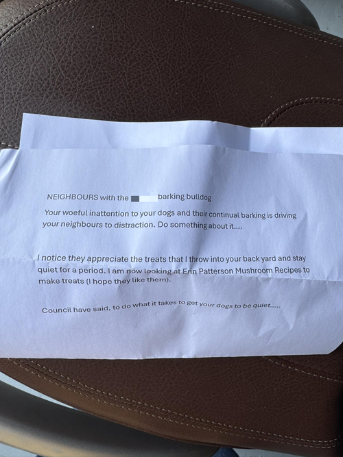 <div class="block-content"><div class="styles__Container-sc-1ylecsg-0 goULFa"><span>A </span><a href="https://www.9news.com.au/sydney" rel="" target="_blank" title="Sydney"><span>Sydney</span></a><span> mum has revealed an anonymous letter she received, threatening to poison her barking dogs with an "Erin Patterson mushroom recipe".</span></div></div><div class="block-content"><div class="styles__Container-sc-1ylecsg-0 goULFa"><span>The woman, who lives in the city's North Shore, said she received a typed note in the mail which demanded she "do something" about her barking dogs.</span></div></div><div class="block-content"><div class="styles__Container-sc-1ylecsg-0 goULFa"><span>"Neighbours with the f---ing barking bulldog," the note begins.</span></div></div><div><div id="adspot-mobile-medium"></div></div><div class="block-content"><div class="styles__Container-sc-1ylecsg-0 goULFa"><strong><span>READ MORE:</span></strong><span> </span><a href="https://www.9news.com.au/national/two-dead-underground-mine-explosion-far-west-nsw/4e39a4bc-ee81-481e-b5d1-0f9a1ec2abf6" target="_blank"><strong><span>Two dead after mine explosion near regional town</span></strong></a></div></div><div class="block-content"><div class="styles__Container-sc-1ylecsg-0 goULFa"><span>"Your woeful inattention to your dogs and their continual barking is driving your neighbours to distraction.</span></div></div><div class="block-content"><div class="styles__Container-sc-1ylecsg-0 goULFa"><span>"I notice they appreciate the treats that I throw into your backyard and stay quiet for a period. I am now looking at Erin Patterson Mushroom Recipes to make treats (I hope they like them)."</span></div></div><div class="block-content"><div class="styles__Container-sc-1ylecsg-0 goULFa"><span>The letter ended by claiming the council said to "do what it takes to get your dogs to be quiet".</span></div></div><div><div class="OUTBRAIN" data-reactroot="" data-src="//www.9news.com.au/national/cremorne-north-sydney-woman-sent-threatening-letter-mentioning-erin-patterson-over-dogs/c510324d-ae69-4616-9623-3d212999ffc5" data-widget-id="AR_5"></div></div><div class="block-content"><div class="styles__Container-sc-1ylecsg-0 goULFa"><span>In post to a local social media group, the letter recipient said she has contacted the police.</span></div></div><div class="block-content"><div class="styles__Container-sc-1ylecsg-0 goULFa"><strong><span>READ MORE:</span></strong><span> </span><a href="https://www.9news.com.au/national/pauline-hansons-one-nation-to-change-name-to-one-nation/0e4a0580-8268-43d9-9c29-ba68efd50d71" target="_blank"><strong><span>Pauline Hanson changes party name as polling support surges</span></strong></a></div></div><div class="block-content"><div class="styles__Container-sc-1ylecsg-0 goULFa"><span>She said her dogs are old and do bark often, but that they did not deserve to die.</span></div></div><div class="block-content"><div class="styles__Container-sc-1ylecsg-0 goULFa"><span>"Trust me the dogs barking annoys me as well," she wrote.</span></div></div><div class="block-content"><div class="styles__Container-sc-1ylecsg-0 goULFa"><span>"I just want my dogs to live [sic] there last days in peace and not die by poisoning."</span></div></div><div class="block-content"><div class="styles__Container-sc-1ylecsg-0 goULFa"><a href="https://www.9news.com.au/" rel="" target="" title="9news.com.au"><span>9news.com.au</span></a><span> has contacted North Sydney Council and the woman who received the note for comment .</span></div></div><div class="block-content"><div class="styles__Container-sc-1ylecsg-0 goULFa"><a href="https://www.9news.com.au/national/how-to-follow-9news-digital/29855bb1-ad3d-4c38-bc25-3cb52af1216f" target="_blank"><strong><em><span>DOWNLOAD THE 9NEWS APP</span></em></strong></a><strong><em><span>: Stay across all the latest in breaking news, sport, politics and the weather via our news app and get notifications sent straight to your smartphone. Available on the</span></em></strong><span> </span><a href="https://apps.apple.com/au/app/9news/id1010533727" target="_blank"><strong><em><span>Apple App Store</span></em></strong></a><span> </span><strong><em><span>and</span></em></strong><span> </span><a href="https://play.google.com/store/apps/details?id=nineNewsAlerts.nine.com&hl=en_AU&pli=1" target="_blank"><strong><em><span>Google Play</span></em></strong></a><strong><em><span>.</span></em></strong></div></div>