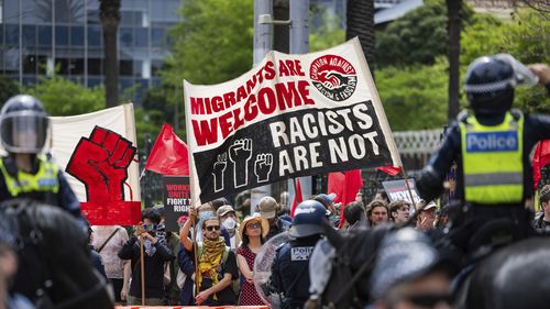 <div class="block-content"><div class="styles__Container-sc-1ylecsg-0 goULFa"><span>Victoria Police have confirmed two officers have been hospitalised after clashing with anti-immigration protesters and counter-protesters in Melbourne on Sunday.</span></div></div><div class="block-content"><div class="styles__Container-sc-1ylecsg-0 goULFa"><span>Hundreds involved in a 'March for Australia' anti mass-immigration rally were met with police and counter-protesters, with police forced to create a barricade between the two groups on Bourke St.</span></div></div><div class="block-content"><div class="styles__Container-sc-1ylecsg-0 goULFa"><span>In a statement released on Sunday afternoon, police said projectiles were thrown.</span></div></div><div><div id="adspot-mobile-medium"></div></div><div class="block-content"><div class="styles__Container-sc-1ylecsg-0 goULFa"><strong><span>READ MORE: </span></strong><a href="https://www.9news.com.au/world/67-meme-usa-generation-alpha/06f4f524-6b9a-4eed-8e10-12dfcf734c40" rel="" target="" title=""><strong><span>Why kids in the US - and across the world - are shouting the '6-7' meme in school</span></strong></a></div></div><div class="block-content"><div class="styles__Container-sc-1ylecsg-0 goULFa"><span>"The police officers were pelted with rocks, glass bottles and fruit whilst trying to protect protestors and the broader community in the vicinity," they said.</span></div></div><div class="block-content"><div class="styles__Container-sc-1ylecsg-0 goULFa"><span>They said one female sergeant was hospitalised with a suspected broken hand, whilst a male constable sustained a laceration to the lower leg; neither officer is in a life-threatening condition.</span></div></div><div class="block-content"><div class="styles__Container-sc-1ylecsg-0 goULFa"><span>One person was arrested, and police say they are searching for more offenders.</span></div></div><div><div class="OUTBRAIN" data-reactroot="" data-src="//www.9news.com.au/national/melbourne-victoria-police-assaulted-protests-australia/1eb44402-0466-4438-8340-ee17b498562e" data-widget-id="AR_5"></div></div><div class="block-content"><div class="styles__Container-sc-1ylecsg-0 goULFa"><span>"We make no apologies for officers having to use force to separate and safely disperse crowds during protests where police have been presented with an extremely volatile and violent environment," Victoria Police Commander of the North West Metro region Wayne Cheeseman said.</span></div></div><div class="block-content"><div class="styles__Container-sc-1ylecsg-0 goULFa"><span>"Police do not attend protests with the aim of using force, but it is always in response to the actions of protestors whether it be violence between different groups, or towards officers," Cheeseman claimed.</span></div></div><div class="block-content"><div class="styles__Container-sc-1ylecsg-0 goULFa"><strong><span>READ MORE:</span></strong><span> </span><a href="https://www.9news.com.au/technology/dodo-hack-cybersecurity-breach-australia/497487b3-f60c-4c93-bd11-2f1a6a65e10e" rel="" target="_blank" title="More than 1600 customers of Dodo and iPrimus impacted by cybersecurity breach"><strong><span>More than 1600 customers of Dodo and iPrimus impacted by cybersecurity breach</span></strong></a></div></div><div class="block-content"><div class="styles__Container-sc-1ylecsg-0 goULFa"><span>Flash bangs used by the police against some protesters were heard, with witnesses claiming riot police worked to push back the pro-immigration protests and disperse the crowd.</span></div></div><div class="block-content"><div class="styles__Container-sc-1ylecsg-0 goULFa"><span>The March for Australia protesters eventually walked away from the counter-protesters after 1pm and marched along Spring St.</span></div></div><div class="block-content"><div class="styles__Container-sc-1ylecsg-0 goULFa"><span>In Sydney, police estimated around 5000 people gathered in the CBD for an anti-immigration protest, but a counter-protest of a similar size was also mounted.</span></div></div><div class="block-content"><div class="styles__Container-sc-1ylecsg-0 goULFa"><span>There were no reports of injuries, clashes or arrests in Sydney, with other protests and counter-protests popping up all over the country on Sunday.</span></div></div><div class="block-content"><div class="styles__Container-sc-1ylecsg-0 goULFa"><span>Thousands gathered for an anti-immigration protest in Brisbane, with politician Bob Katter seen amongst the crowd</span></div></div><div class="block-content"><div class="styles__Container-sc-1ylecsg-0 goULFa"><a href="https://www.9news.com.au/national/how-to-follow-9news-digital/29855bb1-ad3d-4c38-bc25-3cb52af1216f"><em><strong><span>DOWNLOAD THE 9NEWS APP</span></strong></em></a><em><strong><span>: Stay across all the latest in breaking news, sport, politics and the weather via our news app and get notifications sent straight to your smartphone. Available on the</span></strong></em><span> </span><a href="https://apps.apple.com/au/app/9news/id1010533727"><em><strong><span>Apple App Store</span></strong></em></a><span> </span><em><strong><span>and</span></strong></em><span> </span><a href="https://play.google.com/store/apps/details?id=nineNewsAlerts.nine.com&hl=en_AU"><em><strong><span>Google Play</span></strong></em></a><em><strong><span>.</span></strong></em></div></div>